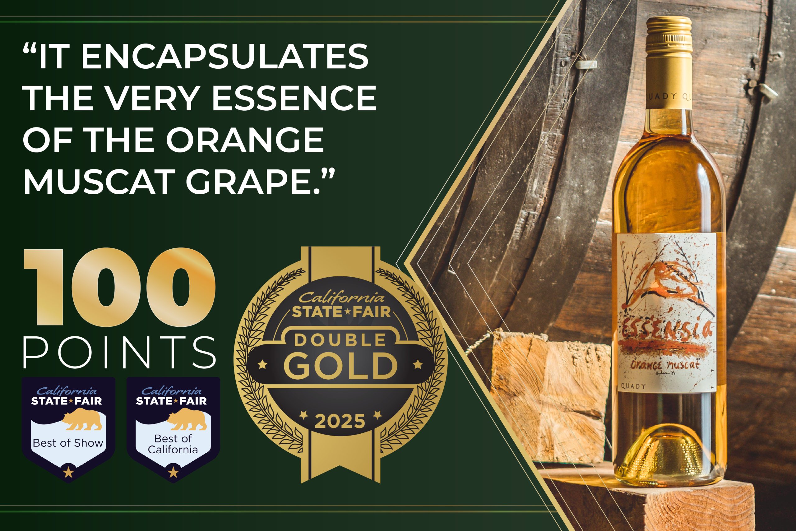 The competition is open exclusively to wines made with fruit grown and produced in California’s 11 wine-growing regions. Wines are judged by class, varietal, style, and growing region, celebrating the depth and diversity of California’s winemaking industry. Essensia was one of two wines to receive a perfect (100 point) score from the competition, which had more than 1,500 entries.