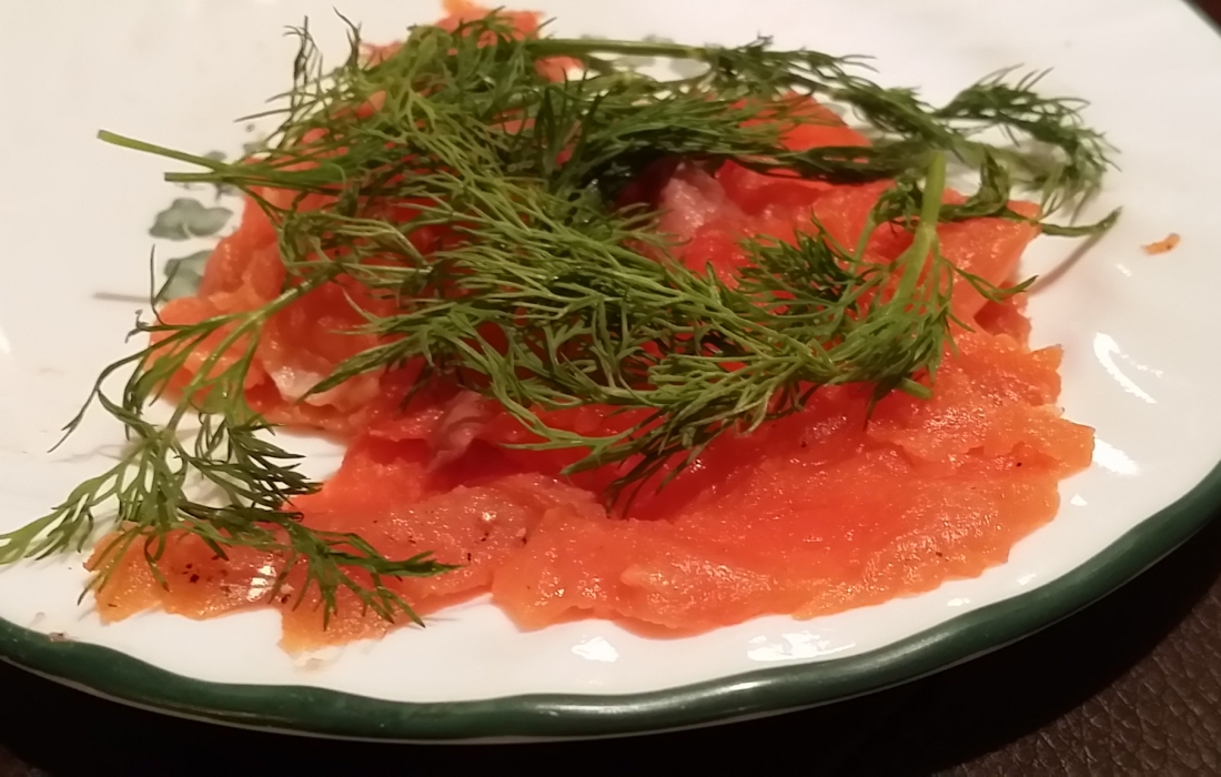 Place half the fish, skin side down, in a glass, enamel or stainless steel dish. Dish needs to be deep enough to hold both layers of the fish & platter to cover fish inside the bowl. Wash, shake dry the dill bunch and place on the fish. In small bowl combine the salt, sugar and crushed peppercorns. Sprinkle mixture evenly over the dill Top with other half of fish, skin side up. Cover with aluminum foil & set platter. Pile the platter with weights – 3 to 4 cans of food work well Refrigerate 48 hours or up to 3 days Turn fish every 12 hours, basting with the liquid marinade that accumulates. Separate the halves to baste salmon inside. Turn the salmon over and replace platter and weights each time. When finished, remove the fish from marinade & separate halves. Scape away the dill & seasonings & pat dry with paper towels. Place skin side down on carving board. Slice salmon halves thinly on the diagonal, detaching from the skin. Serve with mustard sauce, lemon wedges, small toasts or thin rye bread and a lettuce salad.