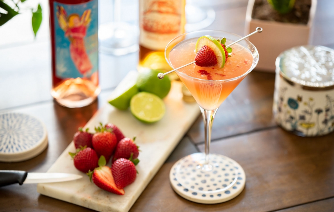 Add Essensia, vodka, lime juice, and strawberries to shaker tin and muddle. Add ice and shake. Strain into a chilled martini glass and top with Electra Moscato Rosé. Garnish with a strawberry and lime wheel. Serve.